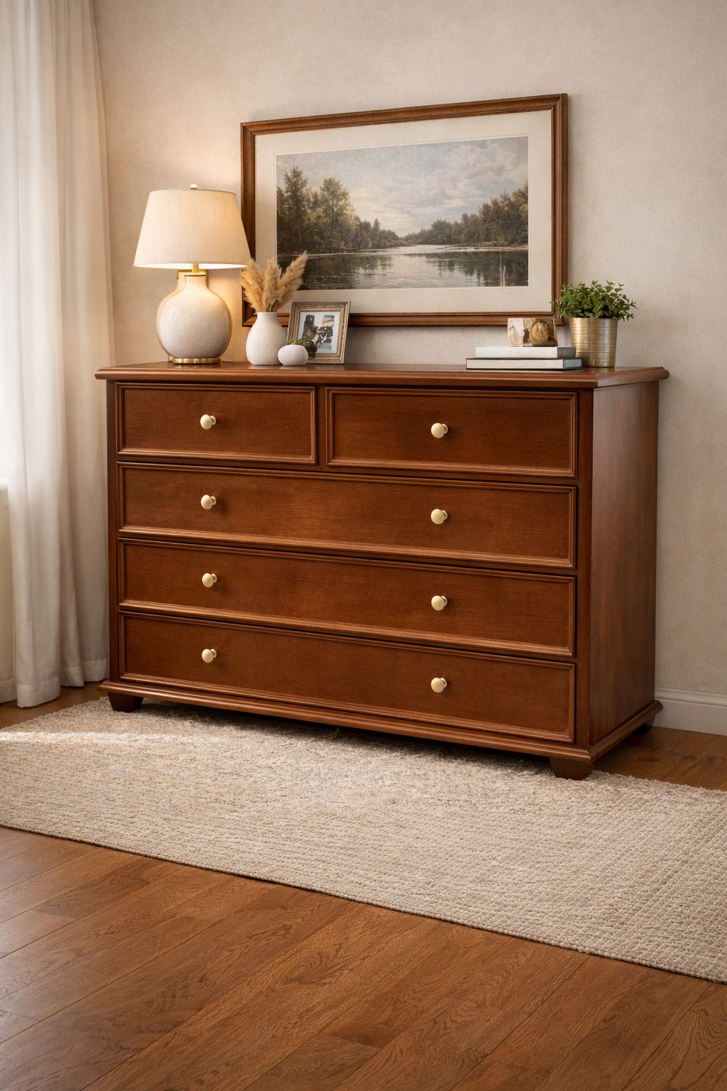 A Cômoda Clássica em Madeira é aquela peça que deixa o quarto mais elegante na hora e resolve a vida no dia a dia. Com linhas tradicionais, acabamento quente e puxadores delicados, ela traz um visual acolhedor e atemporal, combinando fácil com ambientes claros, rústicos ou mais sofisticados.