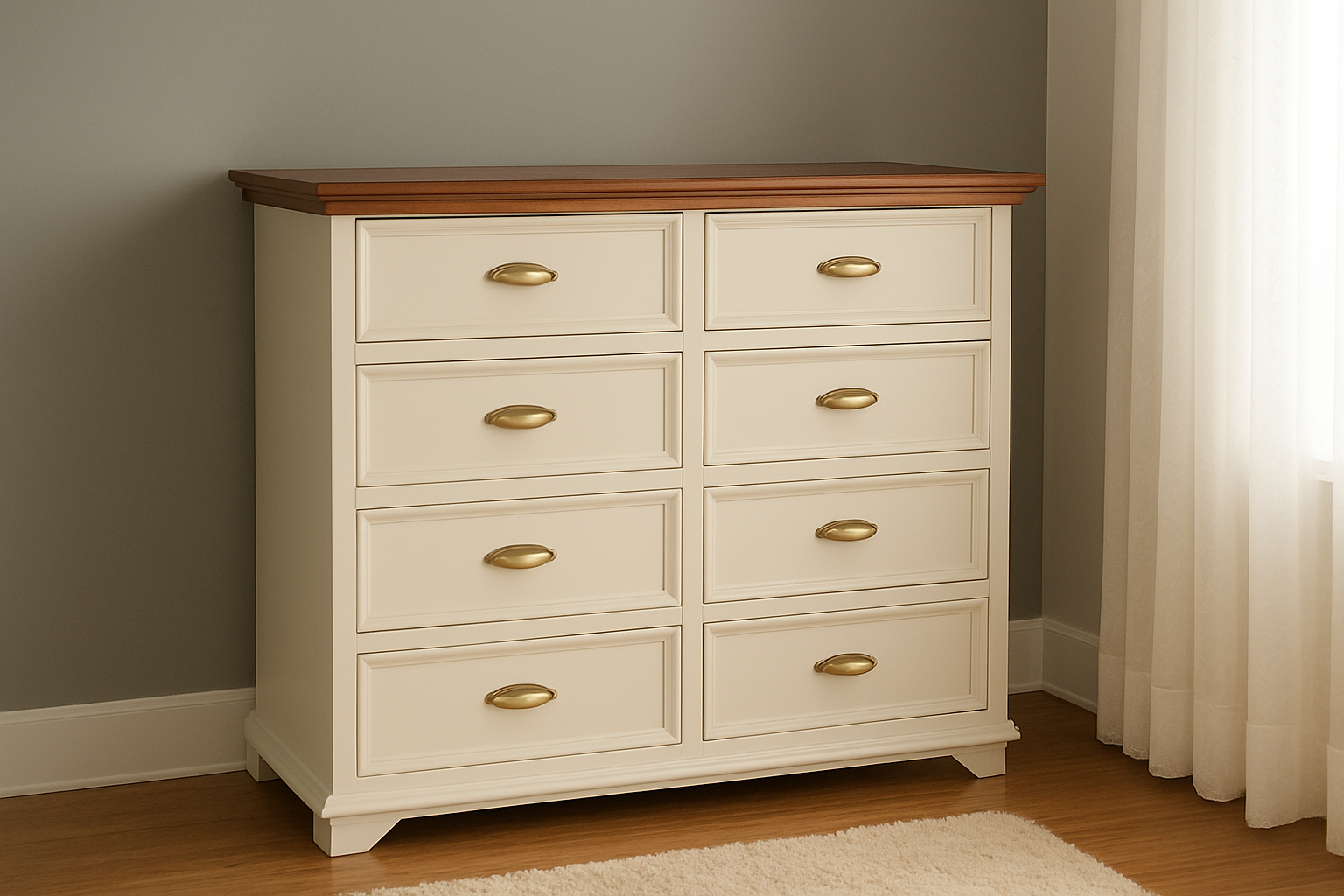 A Cômoda em Madeira Laqueada com Tampo Champagne traz a elegância do design clássico com a resistência da madeira de alta qualidade. Seu acabamento laqueado em tom suave ilumina o ambiente, enquanto o tampo em cor champagne adiciona sofisticação e exclusividade. Com oito gavetas amplas, é ideal para quem busca beleza e funcionalidade em um só móvel.
