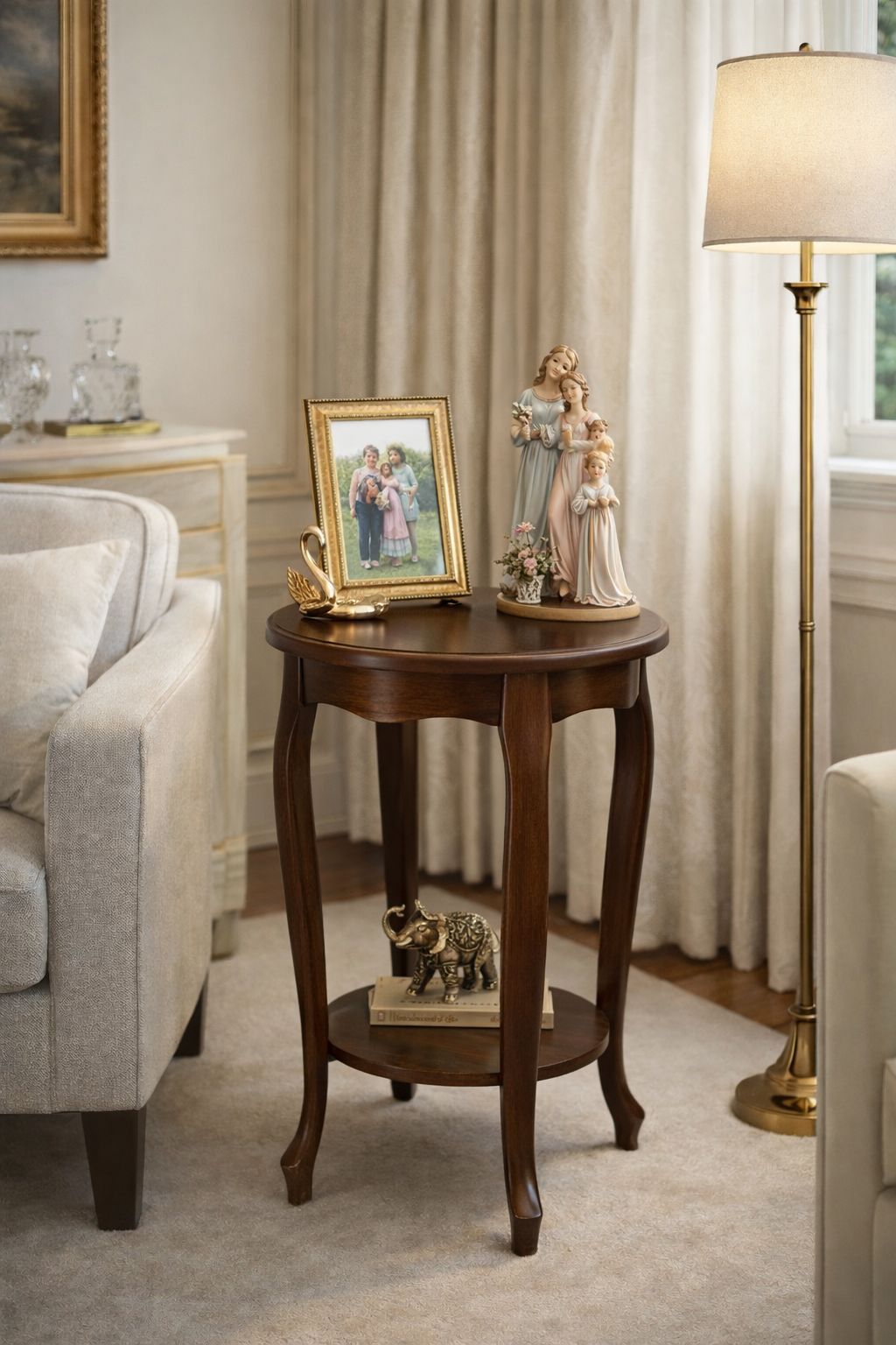 A Mesa Lateral Clássica Redonda é perfeita para compor ambientes sofisticados e funcionais. Seu design elegante com tampo redondo, prateleira inferior e pés curvos valoriza a decoração e traz charme para salas de estar, quartos, halls e espaços decorativos.